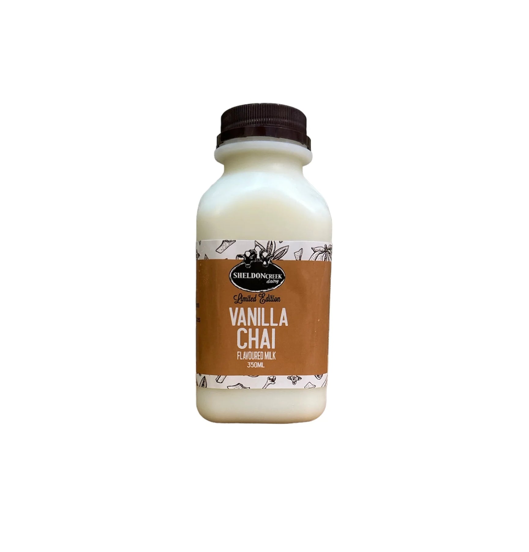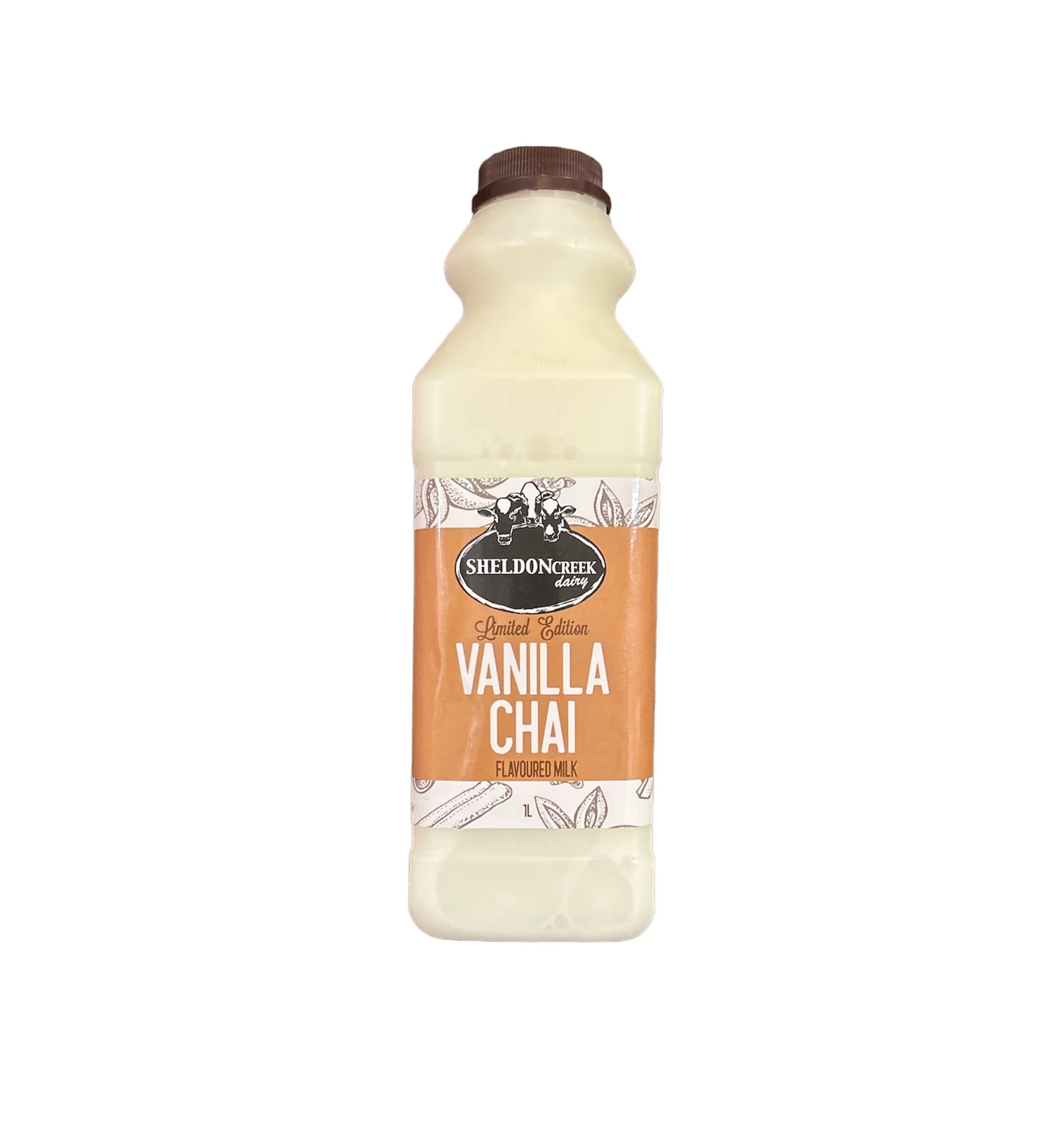 Sheldon Creek Dairy Vanilla Chai Milk is offered in two sizes: 12 oz and 1 L.
