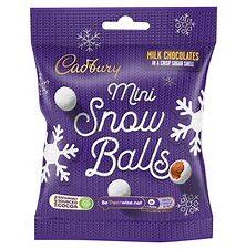 80g Bag. Nothing tastes more like Christmas than the Cadbury Mini Snowballs! Smooth Dairy Milk chocolate, crispy white dusted icing sugar shell Yummy!