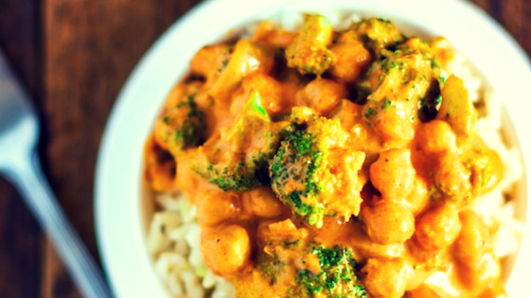 Ingredients: Tomato, coconut milk, coconut oil, onion, broccoli, chickpea, coriander, curry powder, cumin, cayenne pepper, garlic, ginger, cloves, cardamom, cinnamon, star anise, paprika, salt and pepper.