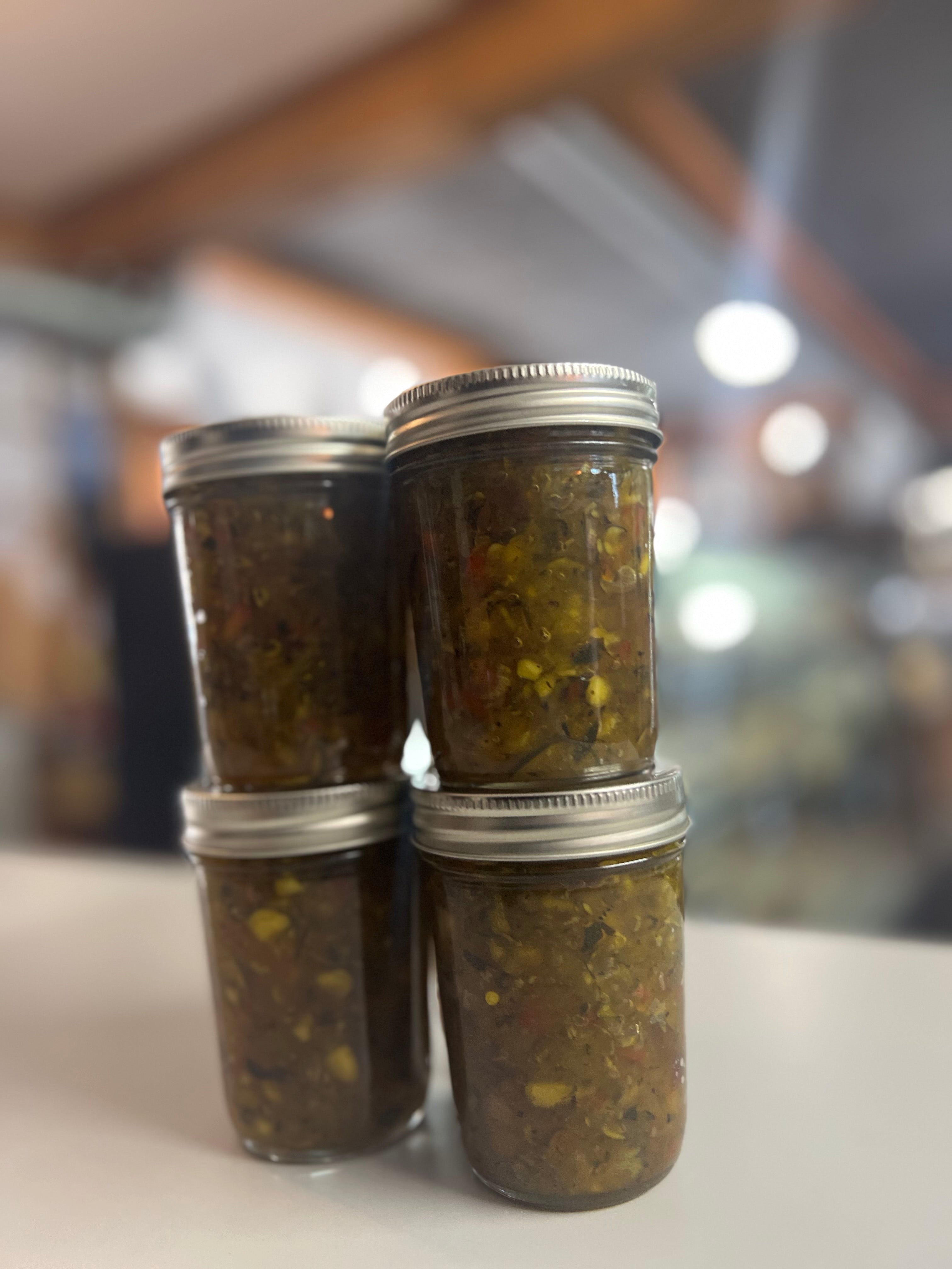 Made with love using zucchini from our garden, perfect on burgers and hot dogs!